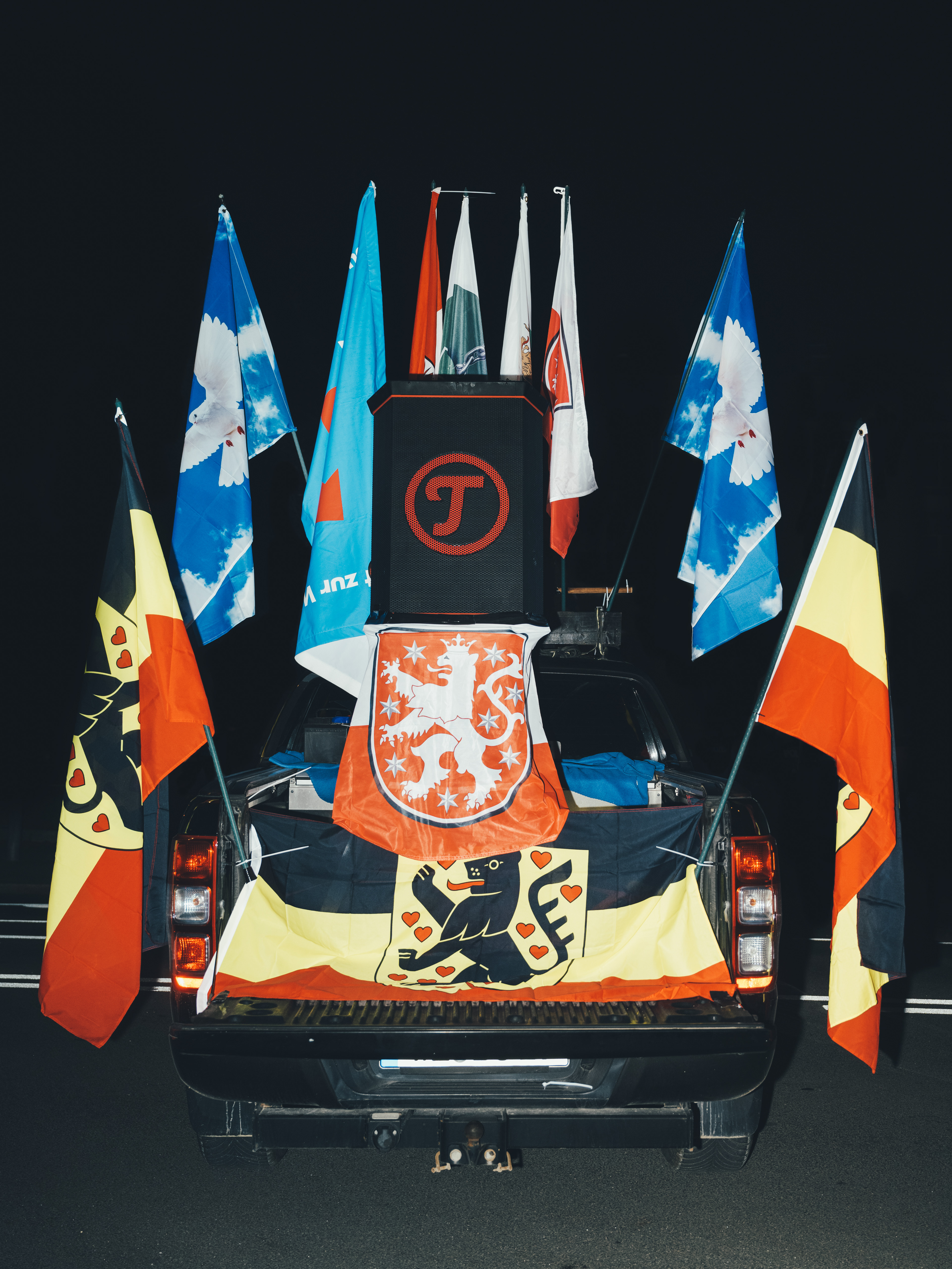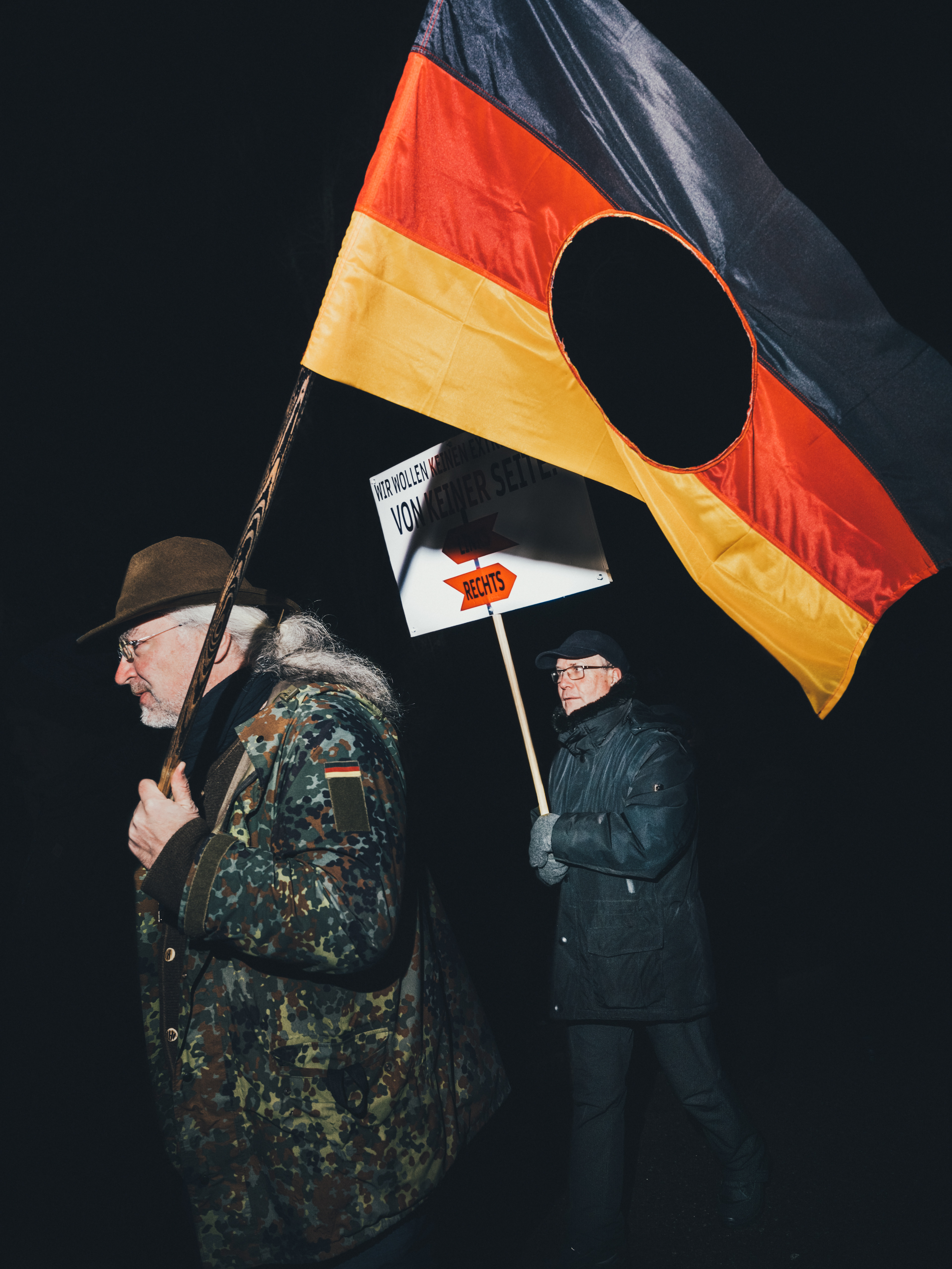 Seit mehreren Jahren dokumentiert Felix Adler die Formen rechten Protests im öffentlichen Raum in Deutschland. Wer sind die Protestierenden, welche Zeichen und Symboliken führen sie mit sich und auf was für ein Geschichts- und Gesellschaftsbild berufen sie sich? Mit einem hart gesetzen Licht, sehr nah und fotografiert in der Nacht, wird der Protest konzeptuell von der Straße gelöst und erscheint wie ein imaginäres, nächtliches Theaterstück.